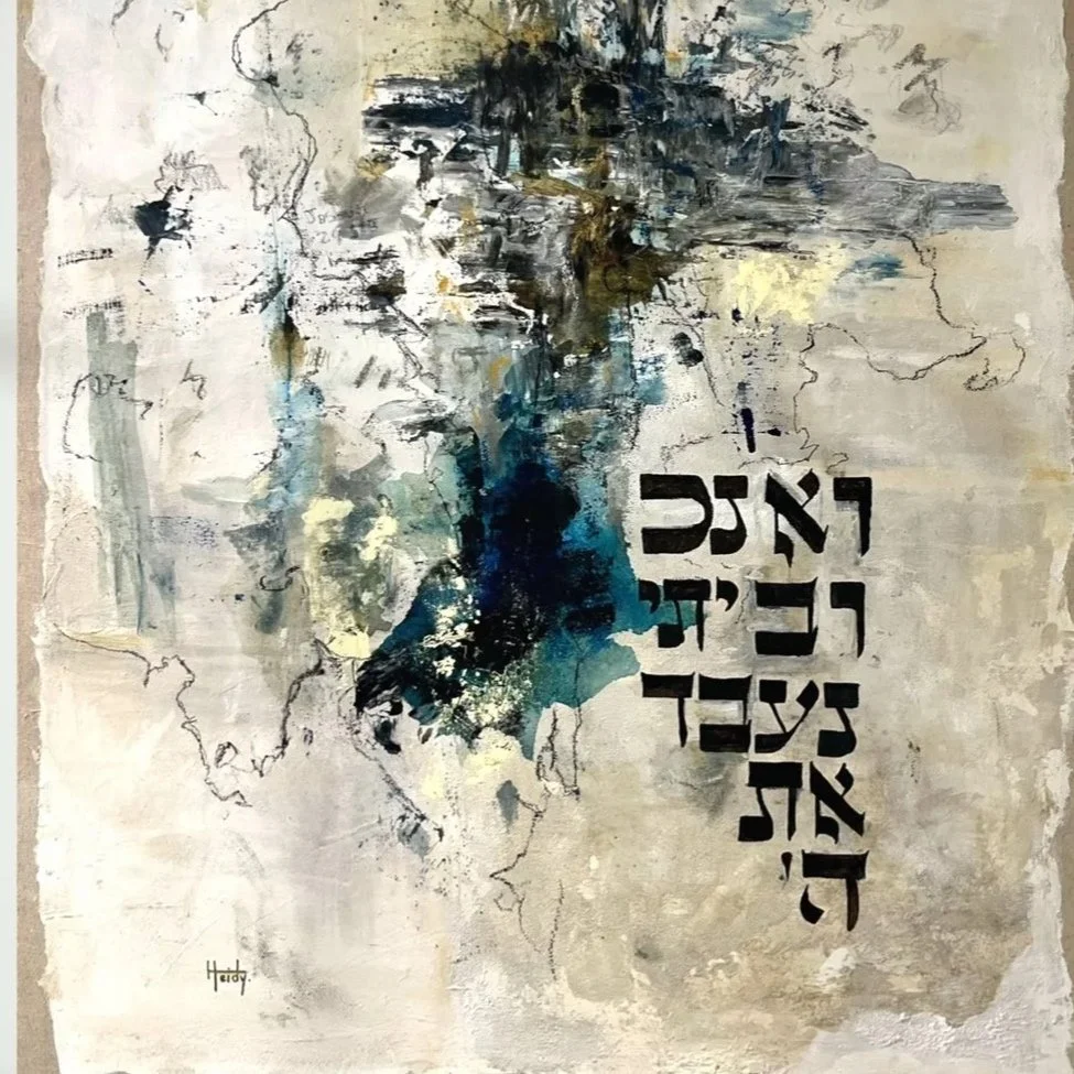 The verse, written in Hebrew across the top of the painting, anchors the piece in both faith and tradition.